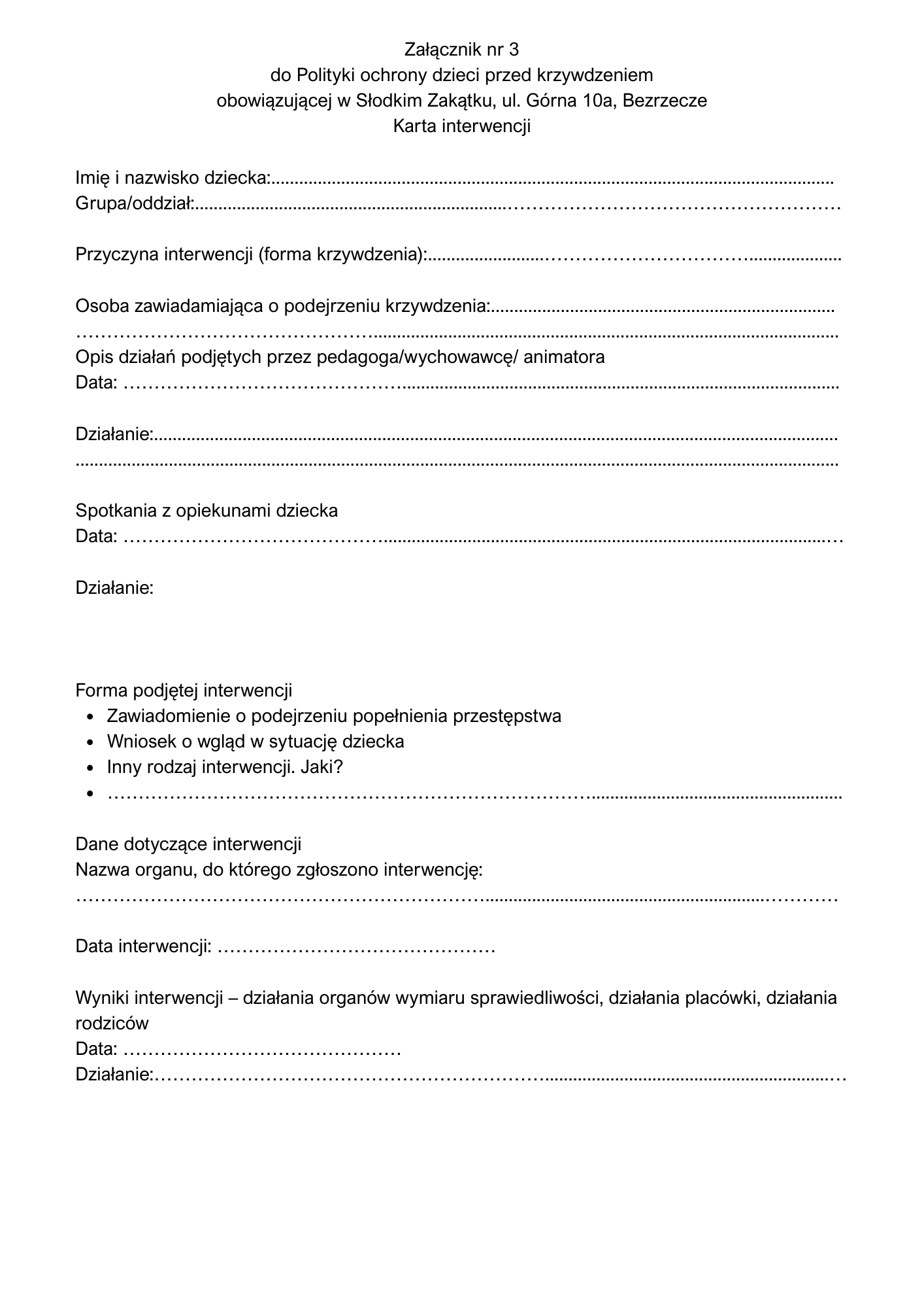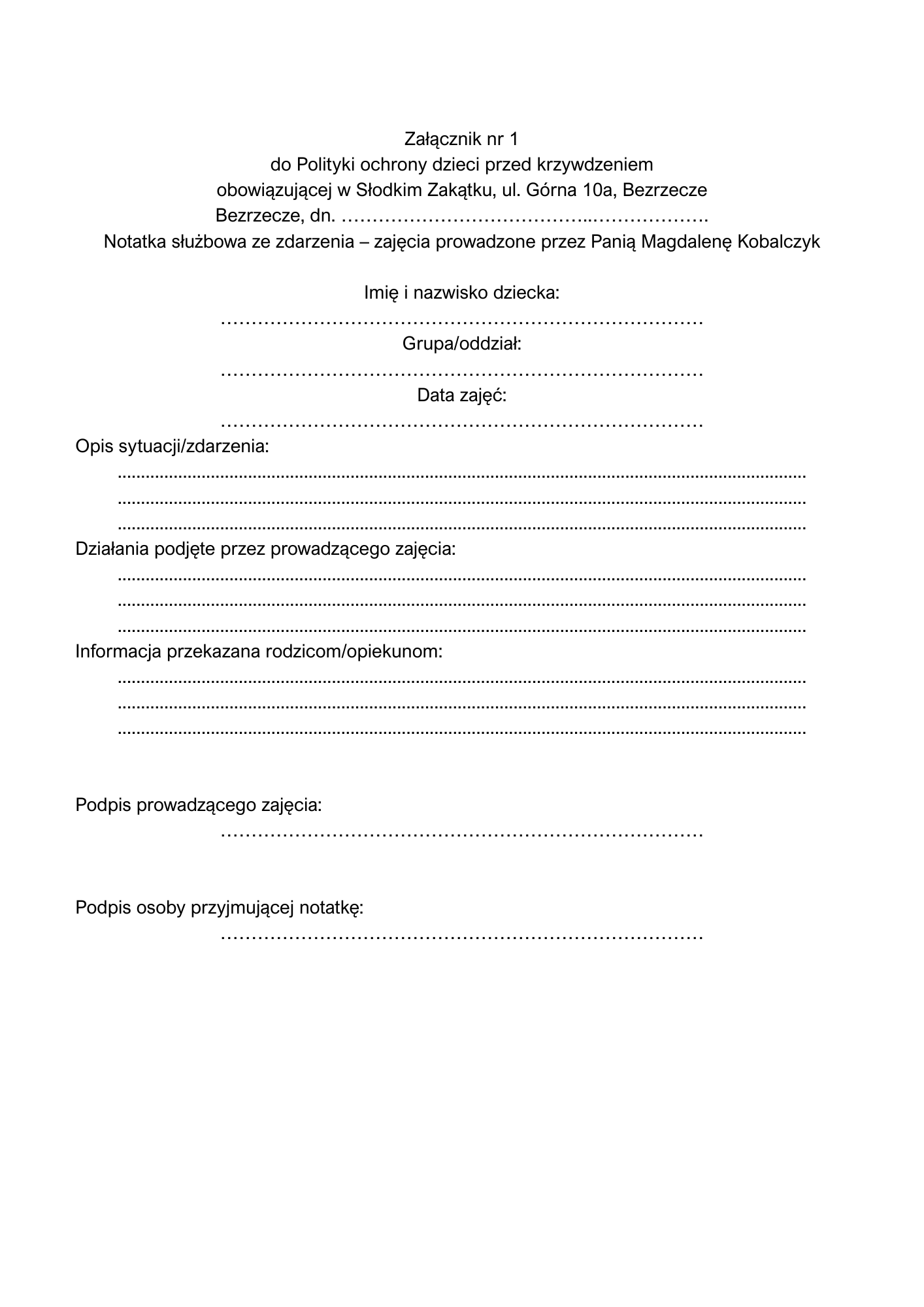 - Podejrzenie krzywdzenia dziecka zgłasza pracownik/Słodkiego Zakątka w formie notatki służbowej, przekazanej Pani Magdalenie Kobalczyk (załącznik nr 3)