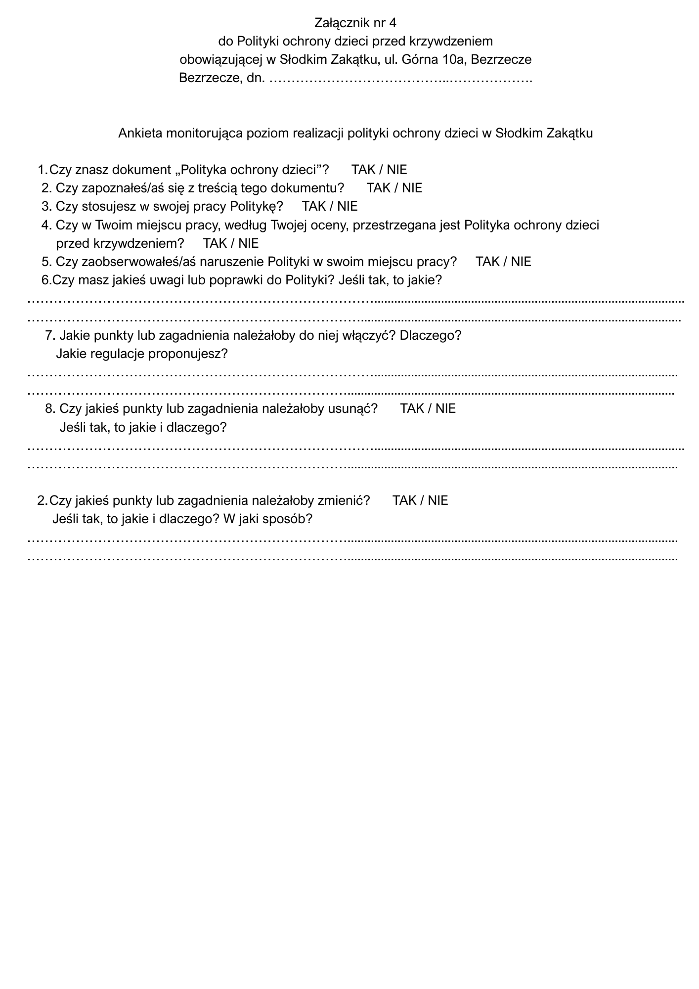 - Politykę udostępnia się personelowi i rodzicom/opiekunom, w tym na stronie Słodkiego Zakątka.